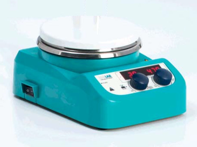Agitatore magnetico riscaldante con piastra in materiale ceramico speciale.