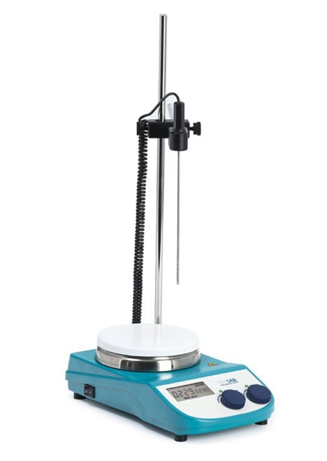 Agitatore magnetico con piastra riscaldante in materiale ceramico speciale di colore nero, modello digitale con tre display di visualizzazione.