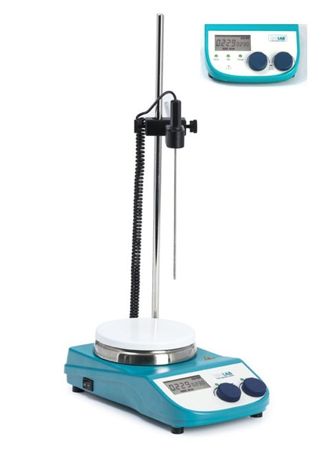 Agitatore magnetico con riscaldamento, dotato di superficie in vetroceramica ad alta resistenza chimica.