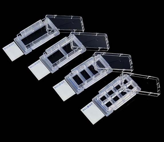 - Cell Culture Slide, singolo pozzetto, telaio in PS, glass slide, supporto in PP, 2.5~5.5ml, Sterile, Dnase&Rnase Free, Non-pyrogenic, confezione da 12 pz