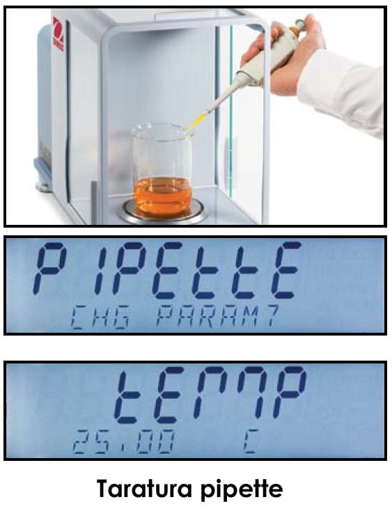 La taratura pipette consiste nel controllo dell’accuratezza dei valori delle pipette attraverso l’analisi della pesata. La bilancia Semi-Micro Discovery DV215CD con risoluzione allo 0.01mg viene consigliata per la sua elevata accuratezza. Per tarare una pipetta, l’utente seleziona il tipo di liquido utilizzato (solitamente acqua), la pressione barometrica, il valore nominale e l’unità di misura della pipetta stessa, la bilancia farà tutto il resto. Il modello Discovery accetta inoltre la densità dei liquidi diversi dall’acqua (g/cc) in relazione alla temperatura ambiente.