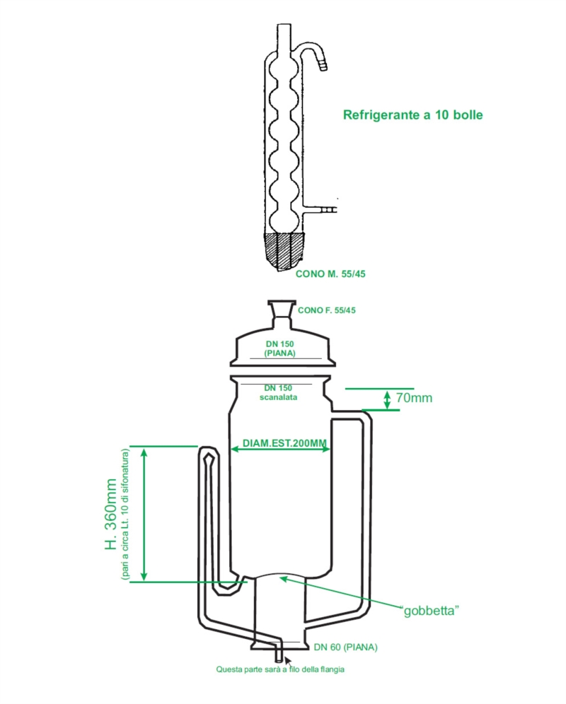 • Corpo estrattore diam. est. Ø 200 mm, flangia Schott scanalata DN 150, altezza parte sifonata 360 mm circa (pari a circa LT 10), flangia inferiore piana DN 60