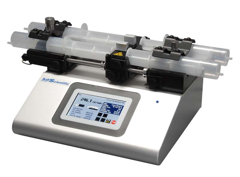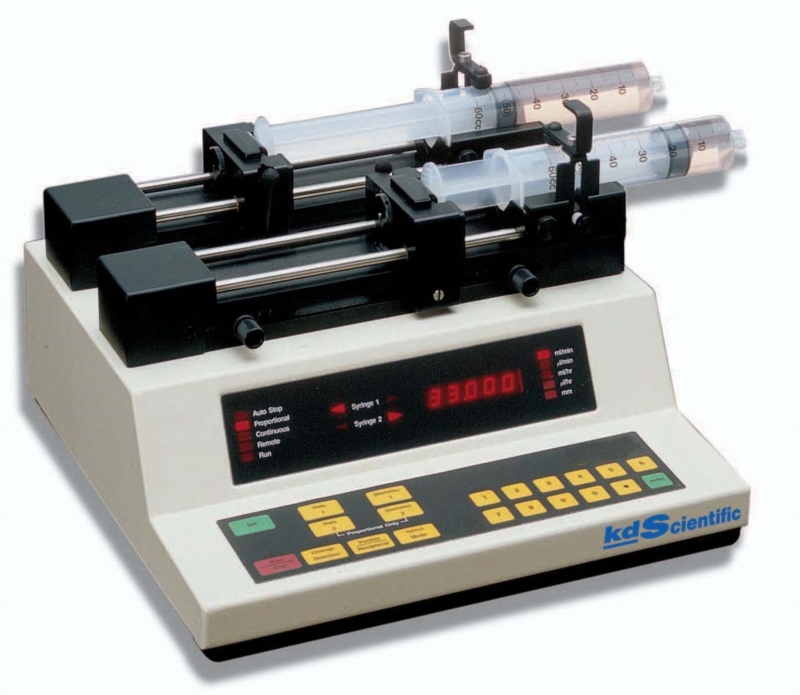 Push/pull syringe pump. Accomodates two syringes for infusion and two syringes for withdrawal. This model supports infusion and withdrawal simultaneously at user defined flow rates and with selectable target volumes to control the total volume pumped. It also supports infuse only, withdraw only, infuse/withdraw/ withdraw/infuse and continuous mode. user defined flow rates with selectable target volumes.
