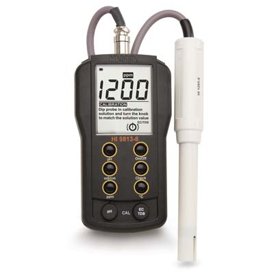 HI 9813-6N è fornito completo di sonda pH/EC/TDS/T HI 1285-6, soluzioni calibrazione pH e conducibilità, soluzione di pulizia, soluzione di test, custodia in similpelle, batteria ed istruzioni.