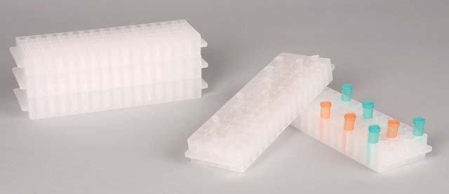 Portaprovette per vials per criogenia, in policarbonato. Ideali per stoccaggio, manipolazione e trasporto. L’orientamento dei campioni è facile con l’indice numerico in rilievo, l’angolo superiore sinistro squadrato, e i lati inclinati. Le linguette stampate sul fondo di ogni foro trattengono le vials in posizione per l’apertura e la chiusura del tappo con una mano. Le scanalature permettono una semplice manipolazione con i guanti. Resistono al congelamento criogenico e sono autoclavabili. Forniti in confezione da 4 pezzi.
