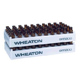 N.B. Nell'immagine sono visualizzati i rack con le vials; queste non sono comprese nella dotazione di fornitura 96 Pos Rack, PP, 9.5 mm Open Id Wheaton vial racks come in a variety of sizes. The racks are manufactured from polypropylene and can be easily cleaned in an automatic washer or autoclaved. The racks are sturdy and can be stacked, even when the vials are in place.