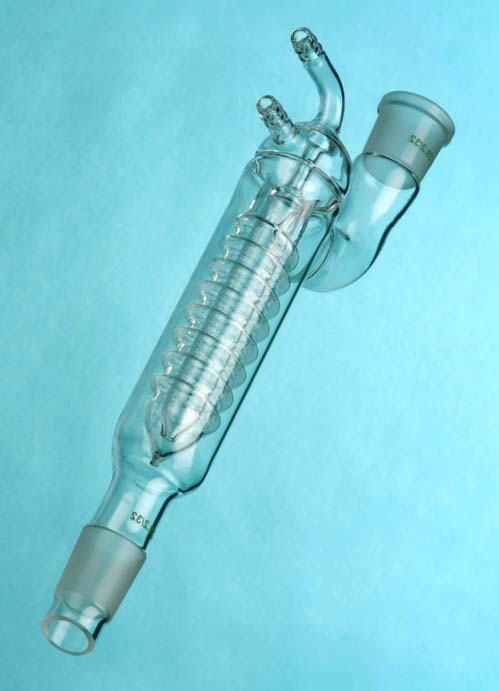 Refrigerante di Friedrichs con vite di raffreddamento, in vetro borosilicato, con raccordi conici NS 29/32 e attacchi a portagomma per circolazione fluido.