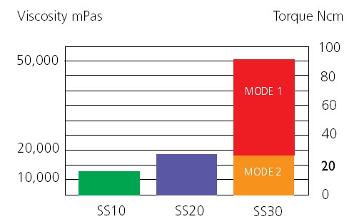 - La prima con coppia elevata e bassa velocità rotazionale, ideale per i liquidi ad elevata viscosità