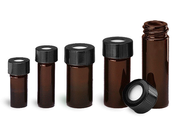 Vials in vetro borosilicato Tipo 1, bianco Wheaton 33® o giallo Wheaton “320”, con tappo a vite fenolico nero chiuso e sottotappo in stirene-butadiene bianco ricoperto di Teflon®, o con tappo a vite fenolico nero perforabile e setto in silicone ricoperto in Teflon®.