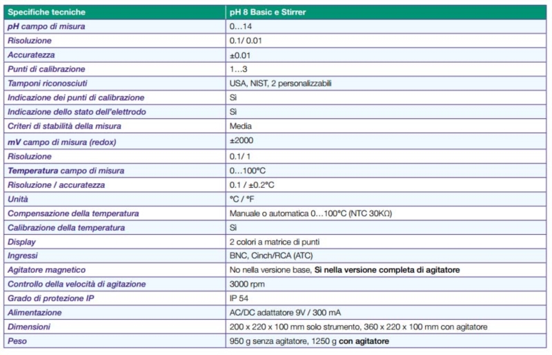 Campo di misura:pH 0,00…14,00 (0,01 pH); mV –2000…+2000 (0,1 mV); °C 0…100,0 (0,1 °C);Versione B KIT COMPLETO. pHmetro pH 8 completo di elettrodo vetro XS Polymer, cavo S7/BNC, sonda di temperatura NT 55, supporto portaelettrodi, agitatore magnetico a velocità regolabile, tamponi colorati, bichieri per la taratura con ancorette magnetiche, ed alimentatore.